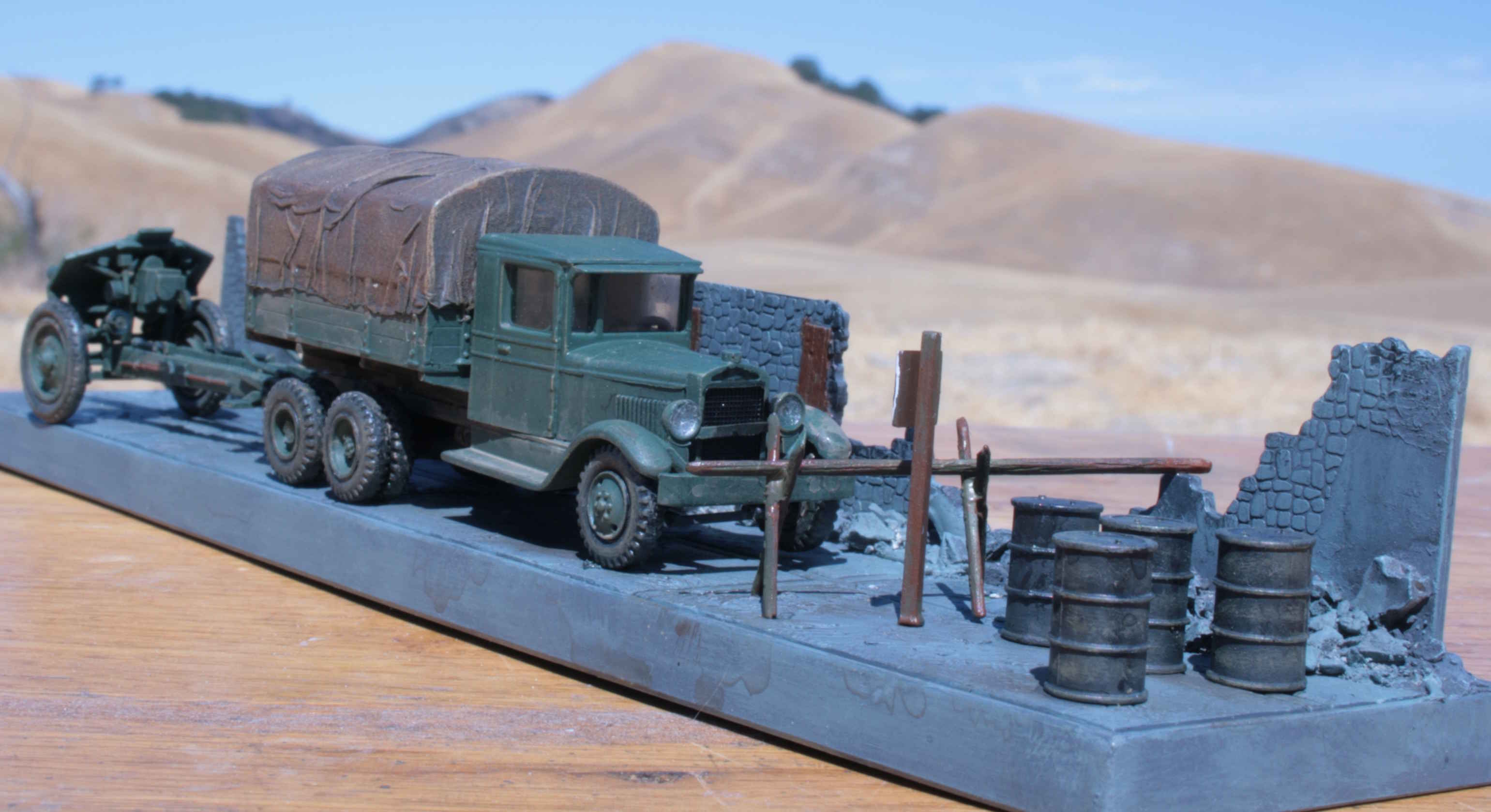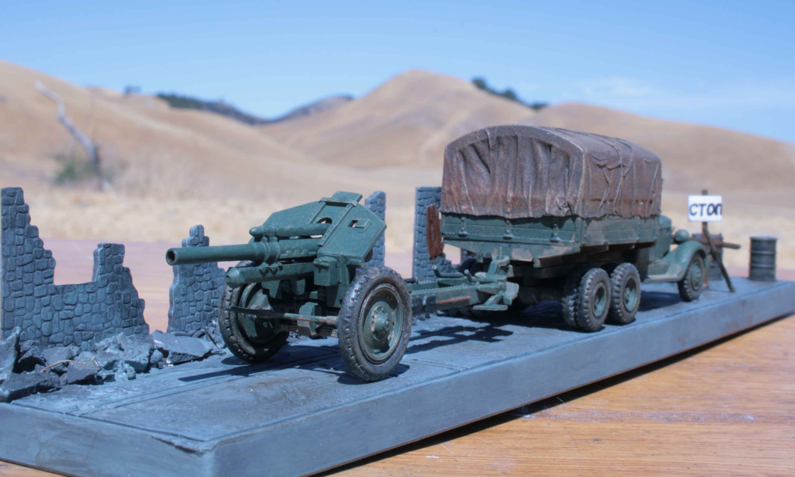 | 1/72 ZIS6 truck and 122mm Howitzer | Model kit by PST | Star Wars figure stand repurposed as a model base. Walls from the Airfix Forward command post. | |||||